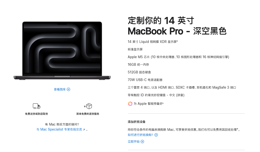 14英寸MacBook Pro同样搭载M5芯片,配备10核中央处理器与10核图形处理器,拥有Liquid视网膜XDR显示屏,支持增强图形功能与第三代光线追踪技术,最高可选配32GB统一内存与4TB固态硬盘,起售价为12999元。