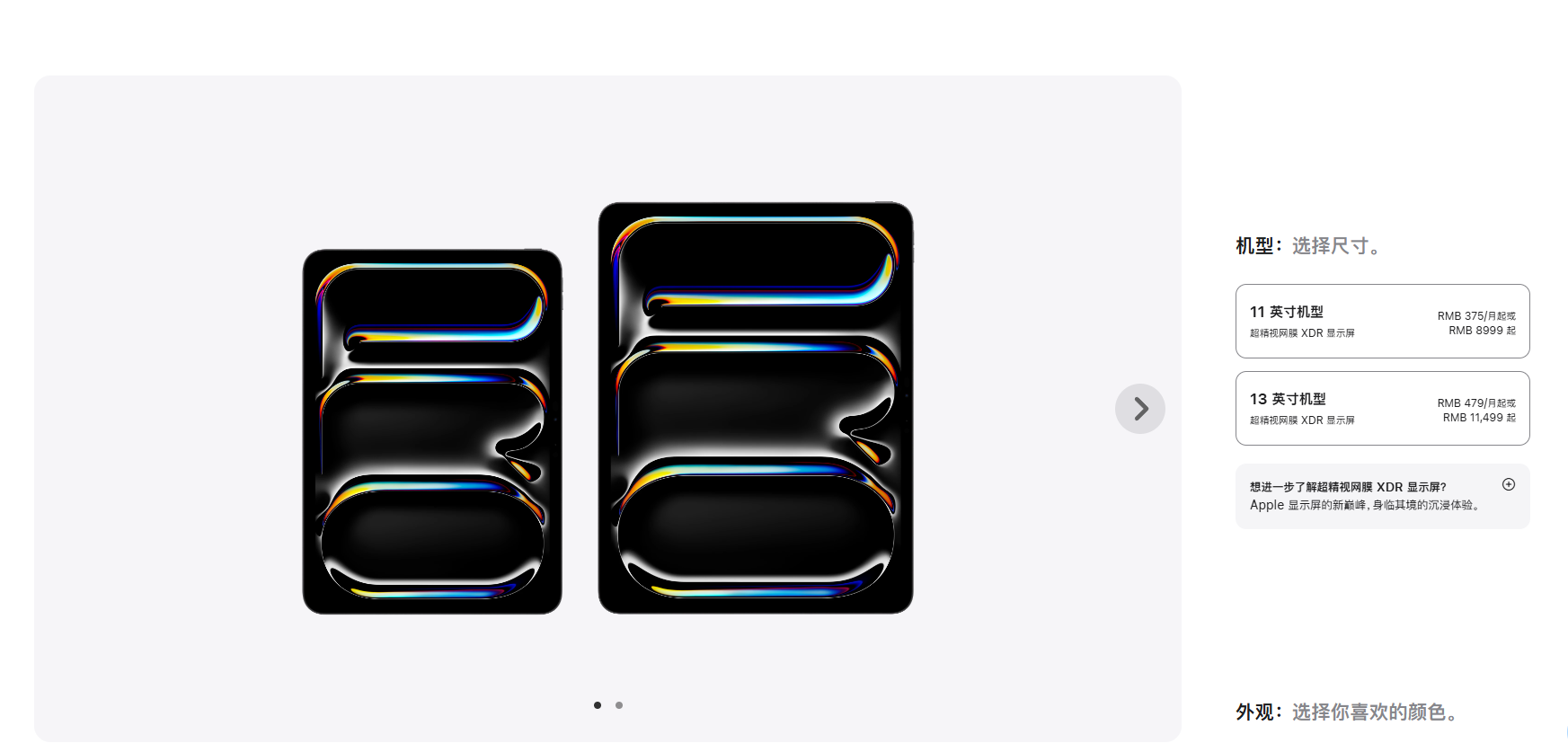 新款iPad Pro提供11英寸与13英寸两种尺寸,搭载M5芯片,配备“超精视网膜 XDR”显示屏,采用双层串联OLED技术,支持ProMotion自适应刷新率,最高可选16GB统一内存和2TB存储,起售价为8999元。
