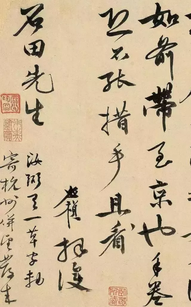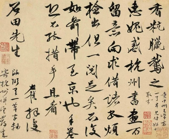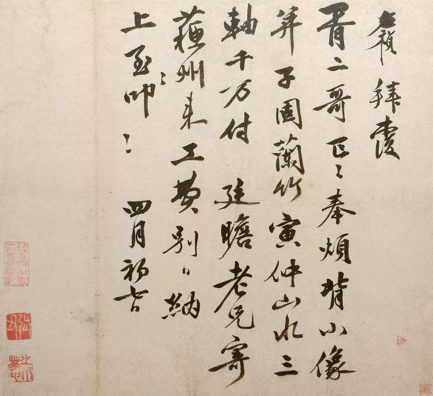 更绝的是,这信里头还透着股子“人情味儿”。李应祯跟沈周聊借书、聊书画,还提到了朋友张弼的草字轴,这不就是咱们平时跟好友唠嗑嘛,亲切又自然。而且啊,这信札还经过清初大收藏家朱之赤、清代“四高僧”之一的髠残收藏,这身价,蹭蹭往上涨!