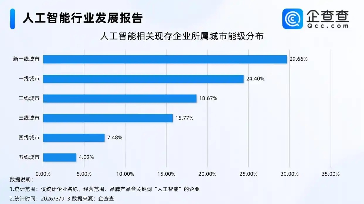 企查查数据显示,截至3月9日,国内人工智能相关现存企业达270.8万家,主要分布在新一线城市、一线城市,合计占比超5成。注册资本方面,超4成相关现存企业注册资本在100万元以内,注册资本在千万元及以上的相关企业,占比13%。注册量方面,近十年人工智能相关企业年注册量基本呈逐年上升趋势,2025年注册量首次突破70万家,同比增长37.85%。